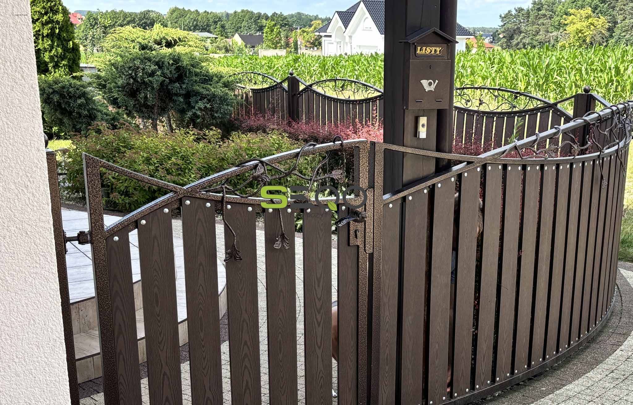 To, co najbardziej przykuwa uwagę w prezentowanym projekcie, to unikalne detale i płynne linie. Zamiast standardowego, prostego zwieńczenia, zastosowano tu przepiękną, metalową nadstawkę z misternym, roślinnym motywem kucia. Pnącza i liście z wdziękiem oplatają górną krawędź płotu, nadając całej konstrukcji lekkości i romantycznego, klasycznego sznytu.