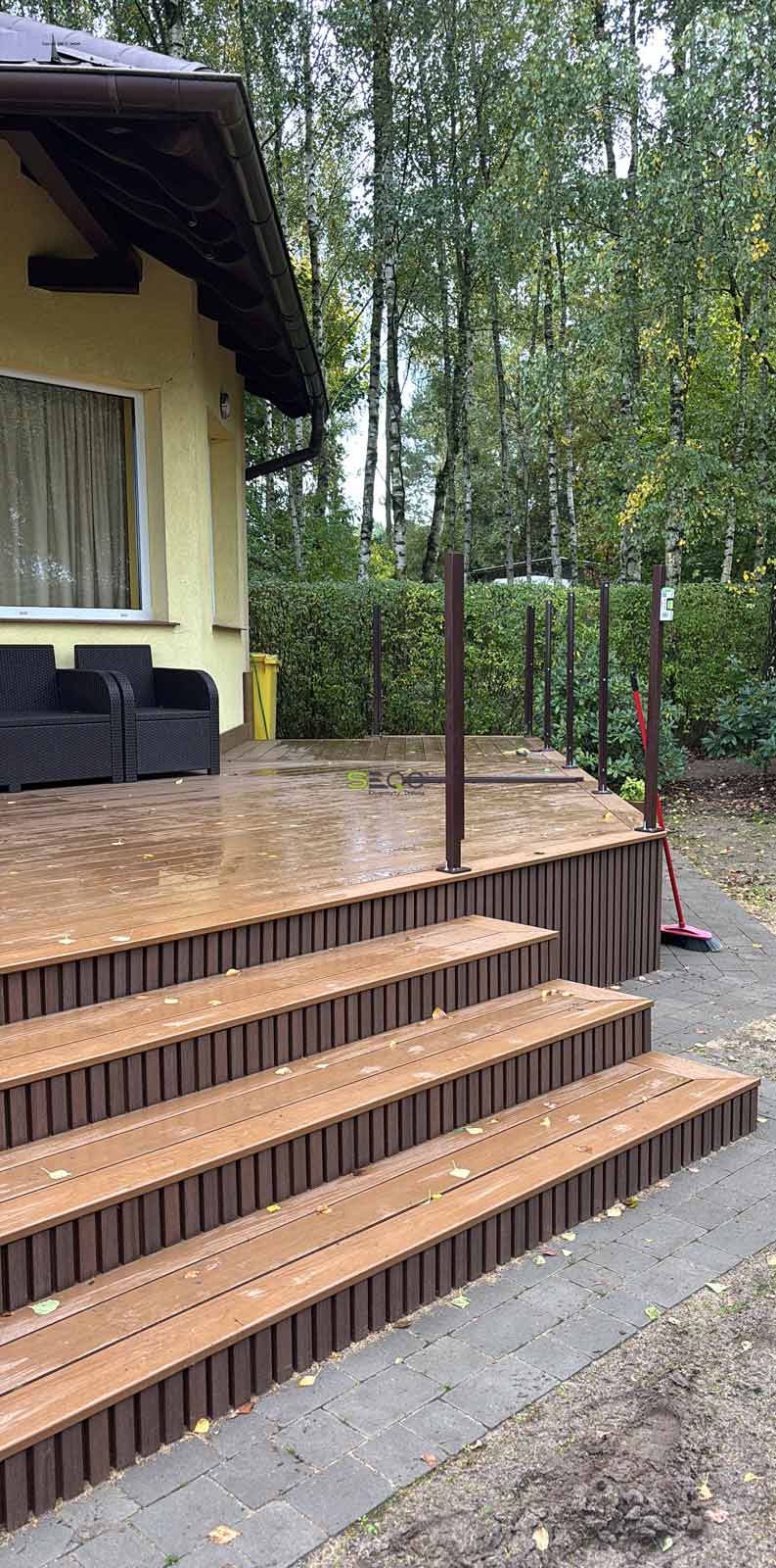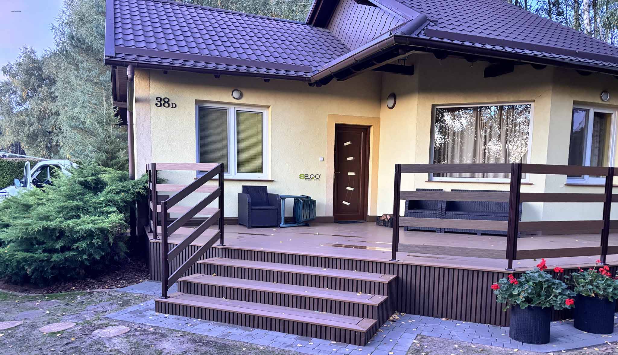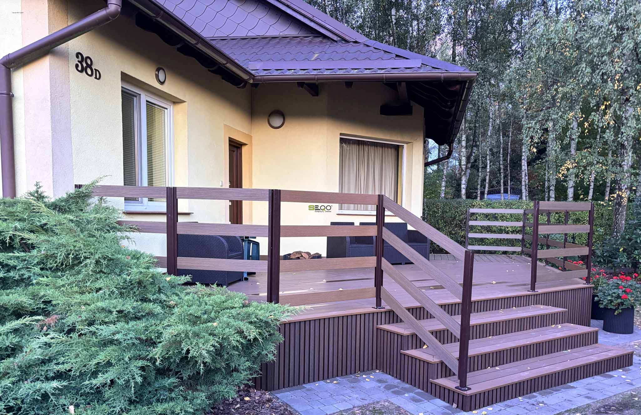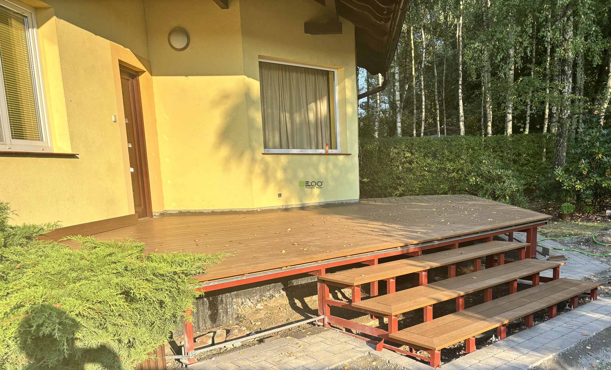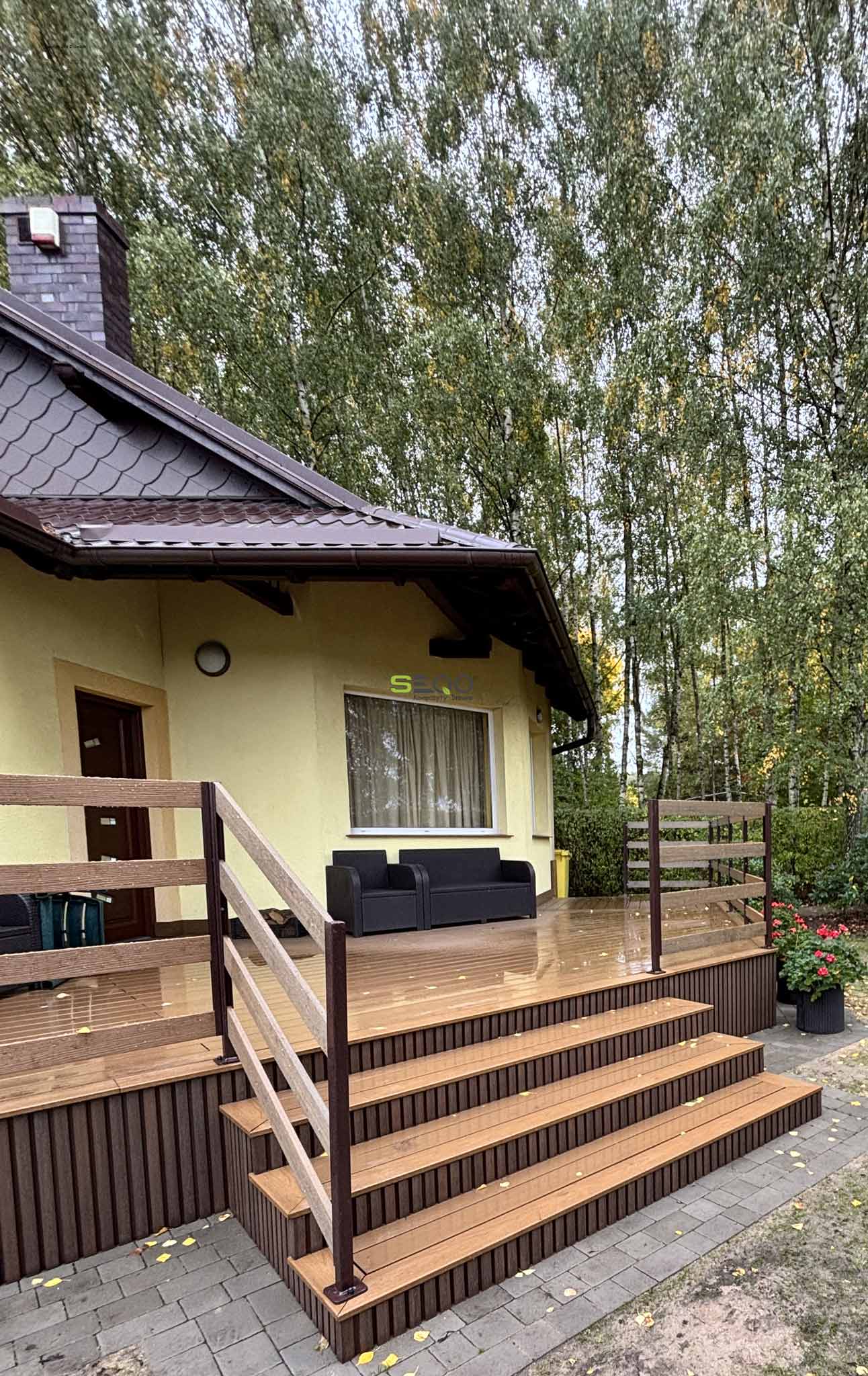 Główną powierzchnię wypoczynkową pokryła niezawodna deska tarasowa EX-138H22. Wybrany przez inwestorów kolor "drewno naturalne" doskonale wpisuje się w leśne otoczenie posesji, wprowadzając do strefy relaksu dużo ciepła. Dzięki zastosowaniu kompozytu, właściciele mogą cieszyć się estetyką prawdziwego drewna bez konieczności jego corocznego olejowania, impregnowania i uciążliwej konserwacji.